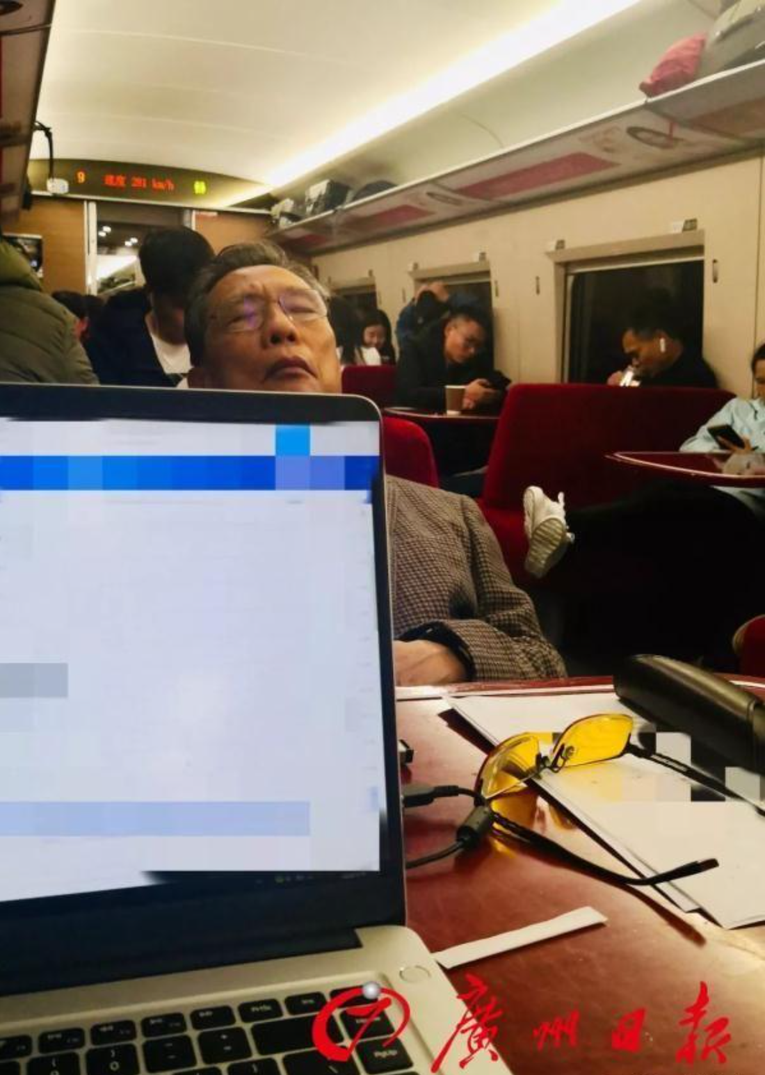 鍾老師終於停下來,閉上眼睛,將頭靠在了椅背上歇息。他滿臉倦容,眉頭緊鎖,兩鬢的白髮,在餐車燈光的照耀下閃閃發光。我心中一動,舉起手機,偷偷拍下了這個畫面。